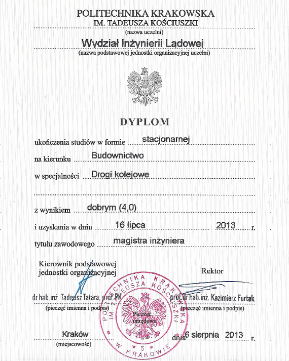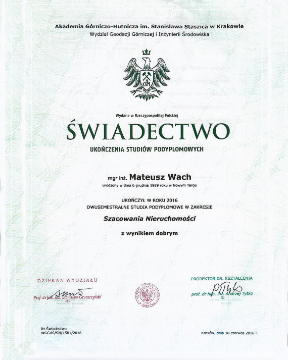 Ukończyłem studia pierwszego i drugiego stopnia na kierunku „budownictwo” naPolitechnice Krakowskiej, uzyskując tytuł zawodowy magistra inżyniera. Zdobyta wiedzatechniczna i zainteresowanie tematyką nieruchomości, spowodowała chęć dalszegokształcenia, co zaowocowało podjęciem studiów podyplomowych na kierunku „szacowanienieruchomości” na Akademii Górniczo-Hutniczej w Krakowie. Po odbyciu praktykizawodowej oraz zdobyciu niezbędnej wiedzy i umiejętności, złożyłem z wynikiempozytywnym egzamin i uzyskałem tytuł rzeczoznawcy majątkowego.