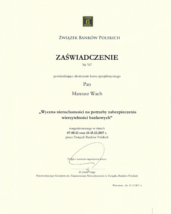 Ukończyłem również kurs specjalistyczny organizowany przez Związek Banków Polskich„Wycena nieruchomości na potrzeby zabezpieczenia wierzytelności bankowych”. Jakorzeczoznawca majątkowy jestem zobowiązany do ciągłego doskonalenia swoich kwalifikacjizawodowych. Poszerzam swoją wiedzę uczestnicząc w szkoleniach, panelach dyskusyjnychoraz czerpiąc wiedzę z publikacji i literatury branżowej.